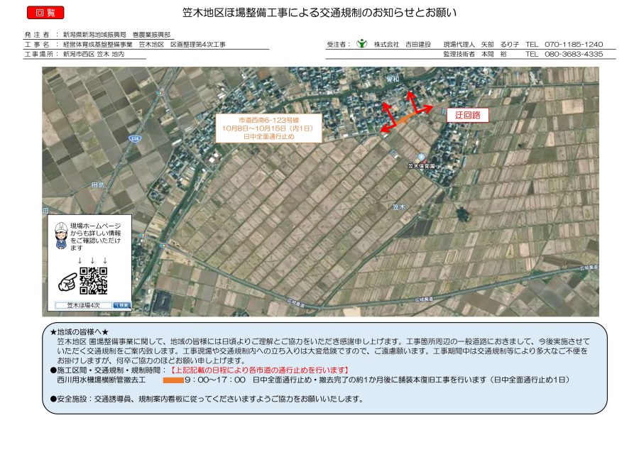新潟市西区笠木にて道路のほ場整備工事に伴う交通規制の実施について、下記の通りお知らせいたします。