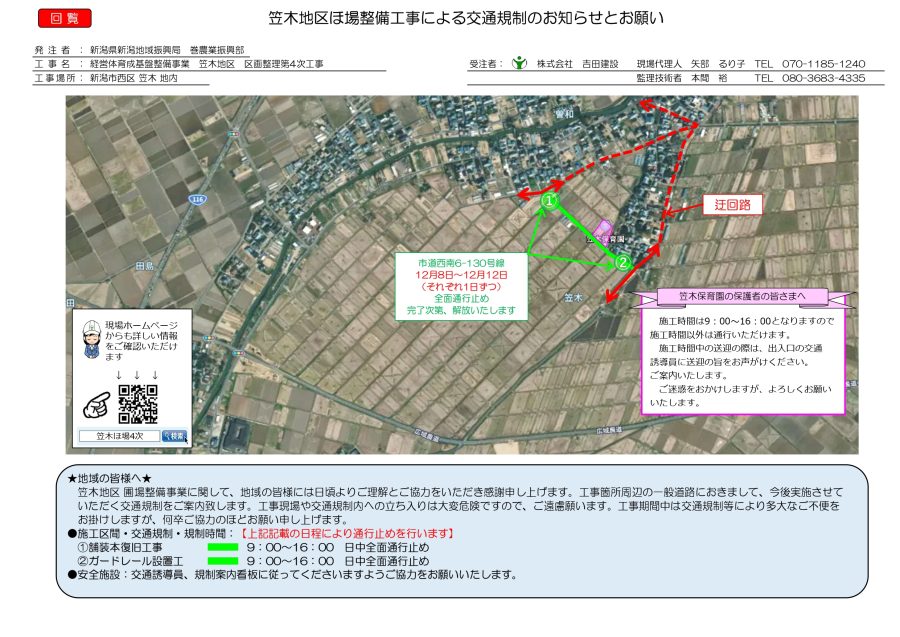 新潟市西区笠木にて道路のほ場整備工事に伴う交通規制の実施について、下記の通りお知らせいたします。