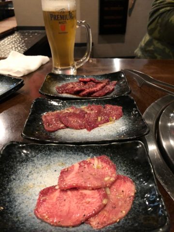 まずは定番のタン塩やハラミ、ナムルなどを注文して、生ビールと共に流し込みます。
