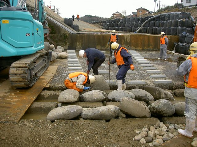 環境にやさしい河川整備のため、コンクリートで囲むのではなく、石を組んで岸や川底をつくることで、自然に近い、川の生き物にとって棲みやすい環境をつくることにより、放流した鮭の稚魚が元気に帰ってくることに期待します。